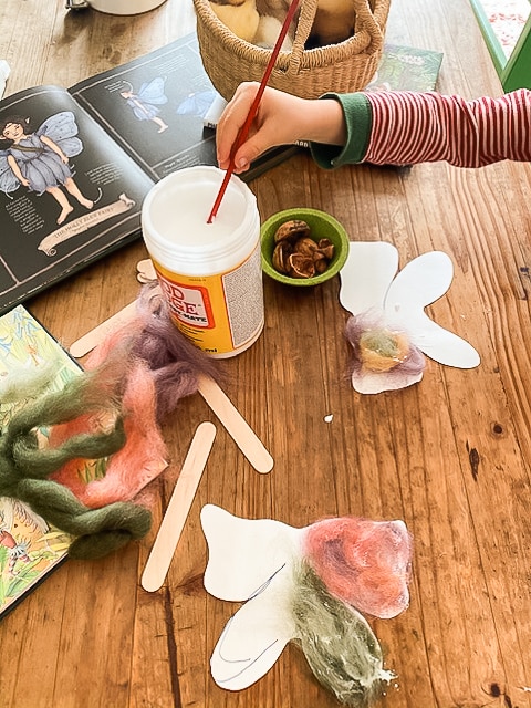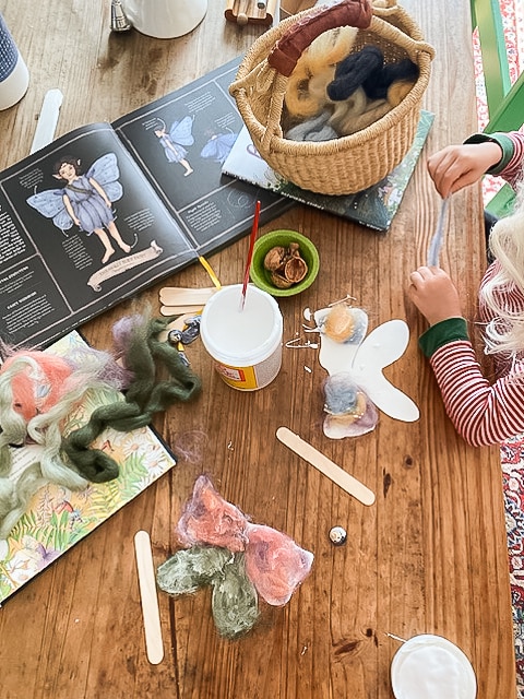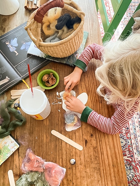 Brittany: We loved discussing fairies! I already had a few fairy books that were perfect to use and then we adapted the popsicle stick fairy craft. We used natural materials of wool roving and Mod Podge. We used walnut shells and seashells we had collected on nature walks as well. It was so much fun. It’s very easy to adapt to Waldorf and crafting is a perfect way especially in the early years. This activity reached the hands, heart, and head.